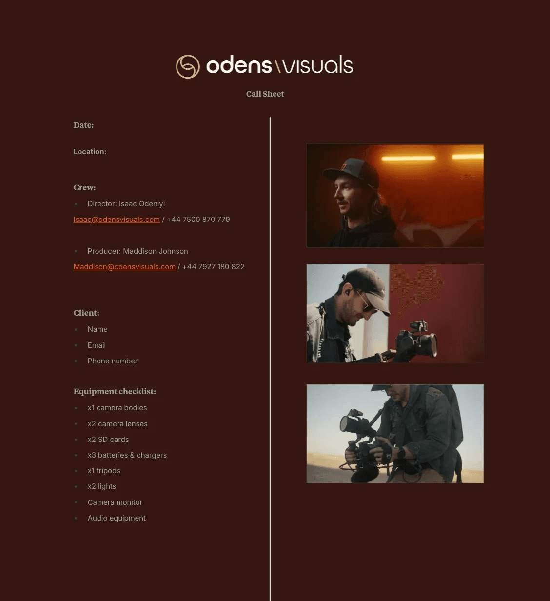 Founded in 2024, Odens Visuals grew from a passion for visual storytelling. Our founder, Isaac, has dedicated his career to building high‑quality visual systems that help businesses build their identity. We believe in the collaboration between clients and our expertise. We succeed in combining creativity with advanced technical ability. We work closely with our clients to understand their unique objectives, crafting bespoke videos that takes a concept to completion with intention.